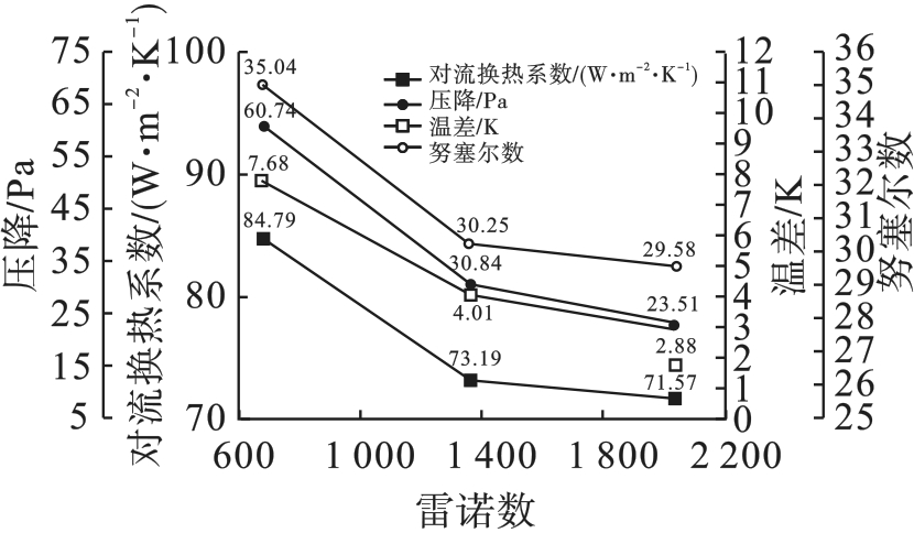| 雷诺数 | 出口速度/ (m·s-1) | 对流换热系数 (W·m2·K-1) | 压降/Pa | 温差/K | 努塞尔数 |