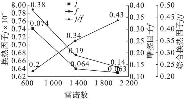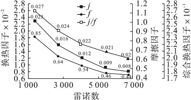 表5 不同雷诺数与换热因子、摩擦因子和综合换热因子的关系 |