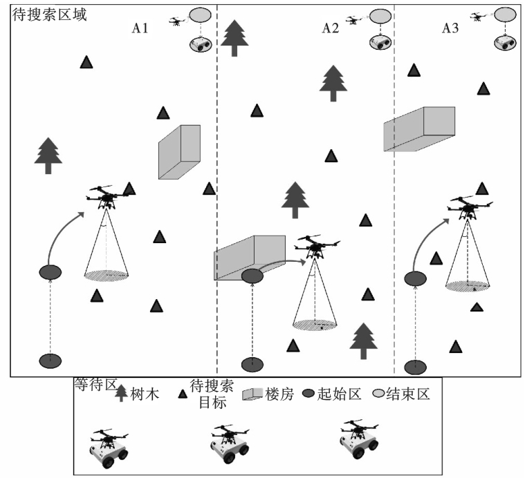 以上算法在任务规划方面取得了一定的进展,但在处理大规模任务时的计算效率仍需提升。因此,本文将进一步探讨UAV和UGV在复杂环境下的搜索任务规划问题,将其拆解为任务分配和UAV航迹规划、UGV的路径规划,进行建模分析,并提出相应的求解算法,结合任务场景进行仿真验证。