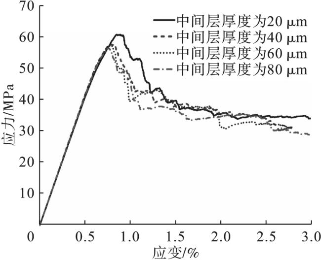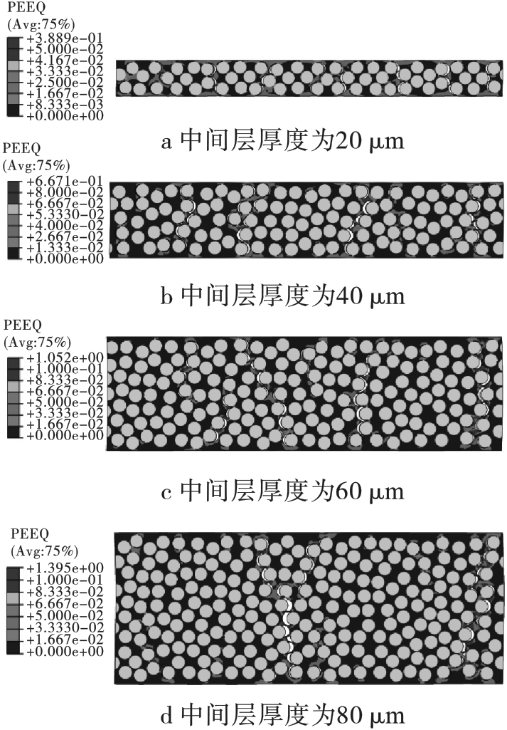 [12]在模型中考虑了纤维的随机排列和界面韧性和强度的正态分布,得出了不同中间层厚度模型在拉伸载荷作用下的损伤变化。Arteiro等