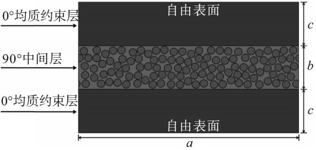 综上所述,尽管基于细观尺度对碳纤维复合材料单层板的低温影响及常温状态下复合材料就位效应的影响已有一些研究,但在低温状态下复合材料层合板的就位效应影响仍缺乏深入研究。目前,采用细观力学模型定量研究微裂纹形成及扩展机理存在一些困难,例如如何定义微裂纹的起始等问题尚未得到很好的解决,这使得基于细观力学模型研究复合材料的就位效应存在定量分析的困难。因此,本文建立了一种考虑相邻层约束的嵌入式多纤维RVE模型,定性预测低温状态下两个0°相邻约束层间的90°中间层的微裂纹起始与演化规律,并探讨低温状态对不同厚度的90°中间层力学性能的影响。