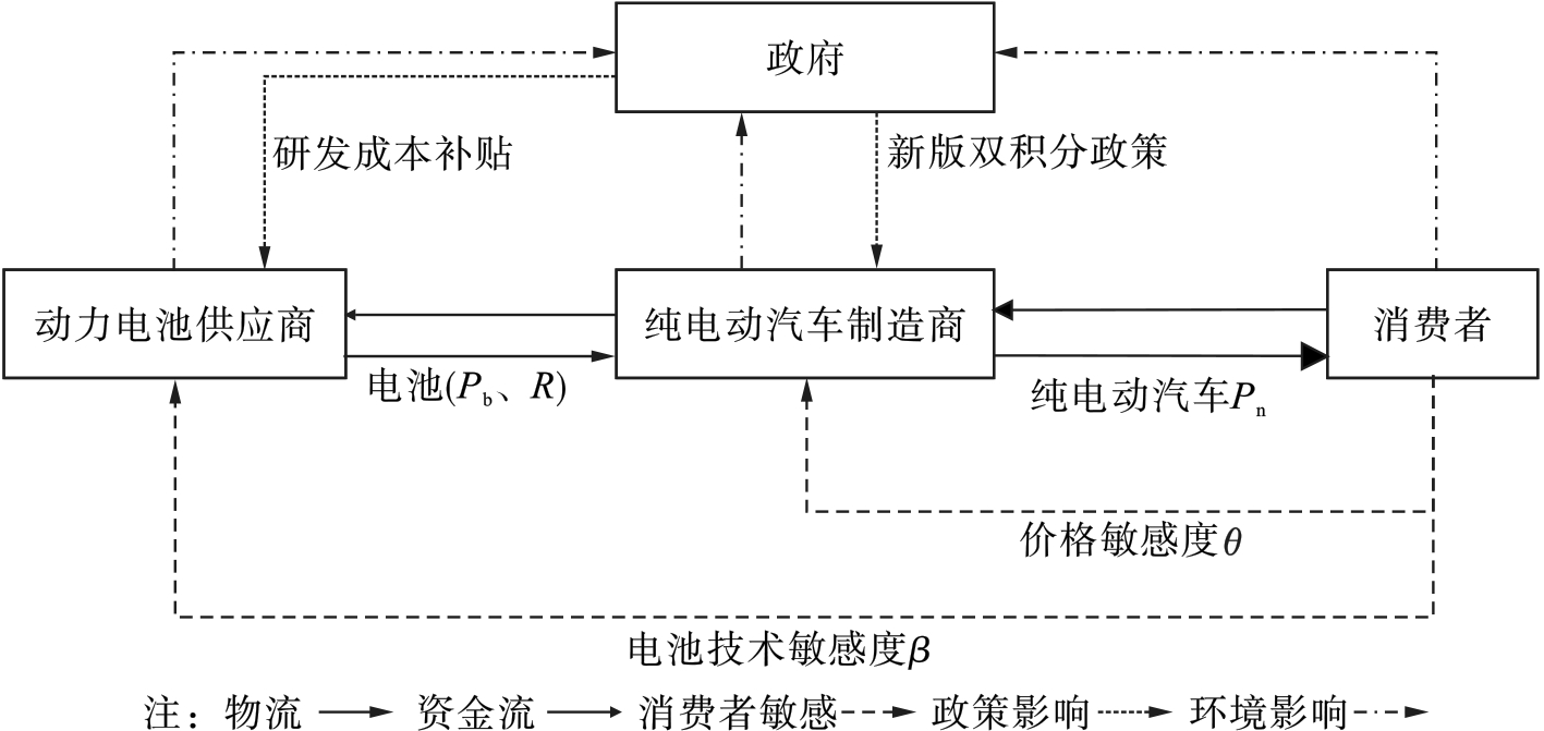 [9]探讨了双积分政策对汽车供应商成员创新决策的作用。汽车的续驶能力不仅与电池有关,还与整车质量、车型设计和能耗等有关,其中电池的质量能量密度在很大程度上影响续驶能力的大小。基于此,本文将电池技术水平作为动力电池供应商的决策变量,电池技术水平由循环寿命、能量密度、安全可靠性等性能构成。