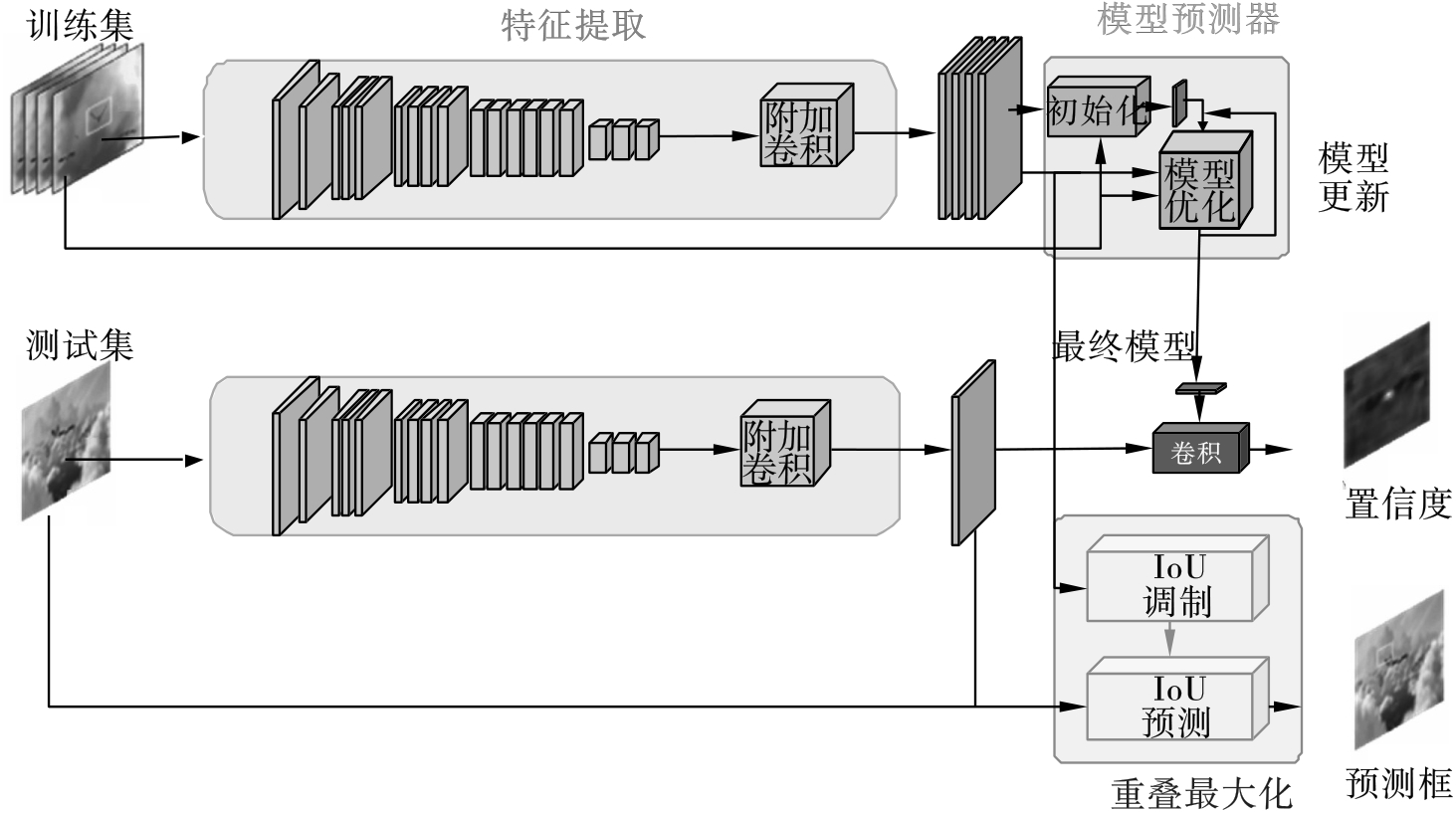 [13]提出DiMP(discriminative model prediction)算法,通过引入判别式跟踪架构,充分地利用了目标和背景的外观信息,在有效处理外观变化的同时,极大提高了算法的跟踪性能。同时,DiMP采用最速梯度下降法对模型进行优化,克服了计算资源限制,在无人机平台上实现了深度学习跟踪算法的应用。鉴于DiMP目标跟踪方法在速度和精度上的优势,其改进方法不断涌现。Danelljan等
