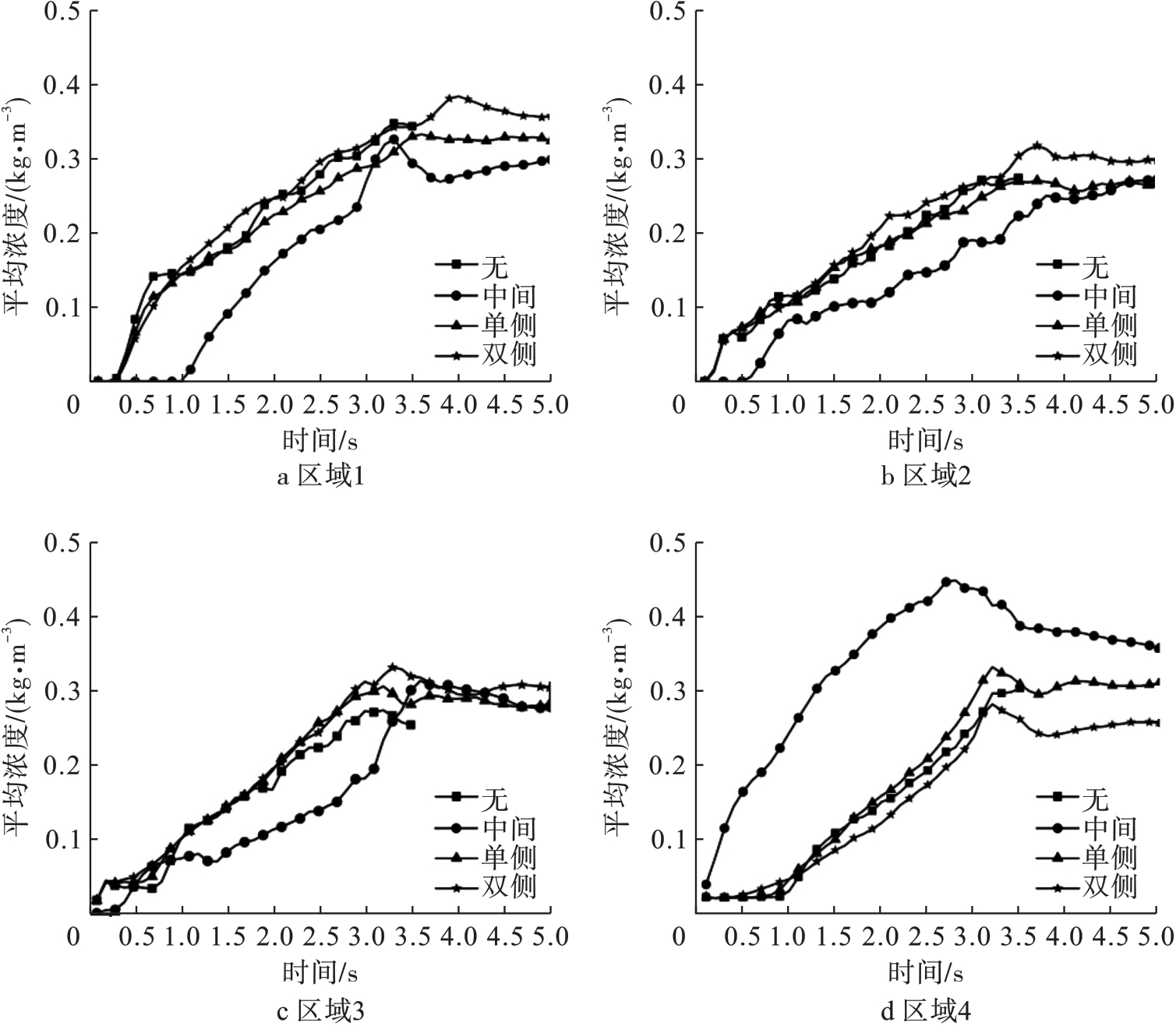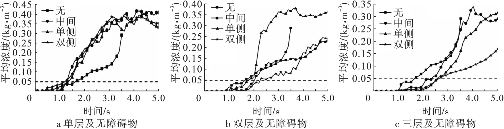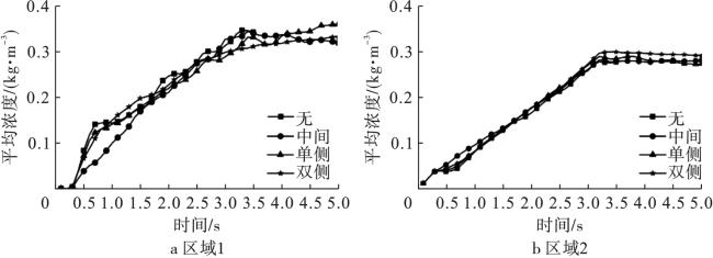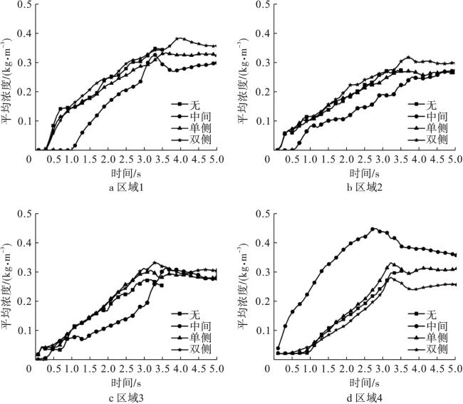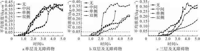 In order to study the influence of obstacle distribution on the flow characteristics of ultrafine dry powder fire extinguishing agent in confined space,a fluent software was used to establish a two-dimensional transient simulation model of gas-solid two-phase flow in the confined space after the release of ultrafine dry powder extinguishing agent, and the spatial flow characteristics of ultrafine dry powder were simulated under the conditions of different layers of obstacles and spatial locations. The results show that both the layer number and distribution of obstacles have a more significant influence on the spatial flow and distribution of ultrafine dry powder. In the early stage of spraying, the concentration of the area under the middle obstacle is significantly lower than that of the other obstacles, while the side obstacles have a more significant influence on the time required to reach the fully submerged fire extinguishing agent in the space. The number of layers of obstacles has a significant influence on the total flooding state of ultrafine dry powder fire extinguishing agent, single-layer obstacles to a certain extent is conducive to speeding up the confined space to achieve the state of total flooding of fire extinguishing agent, while multi-layer obstacles is just the opposite, and with the increase in the number of layers of obstacles, the longer the time required to reach the state of total flooding.